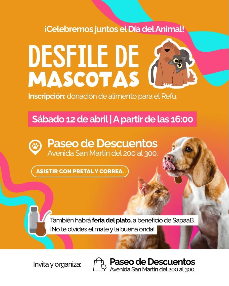 Tendrá lugar este próximo sábado 12 de abril, a partir de las 16 horas, un desfile de mascotas. Dicho desfile se llevará a cabo en la Av. San Martín entre el 200 y el 300, donde también habrá un Paseo de Comerciantes.