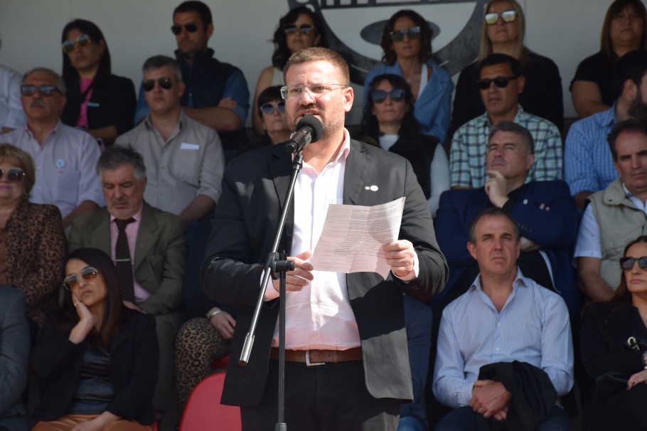 En primera instancia, luego del izamiento de la bandera nacional y bonaerense, y también después de la bendición por parte del cura párroco Alejandro Boudgouste, tomó la palabra Germán Behrens, quien comenzó repudiando fuertemente el atentado al presidente y vicepresidente de la Asociación Rural Argentina: "tenemos que entender que nuestra participación en las instituciones es para ayudar, lógicamente, sabemos que estamos abiertos a las críticas, pero no a recibir estos tipos de atentados terroristas".
