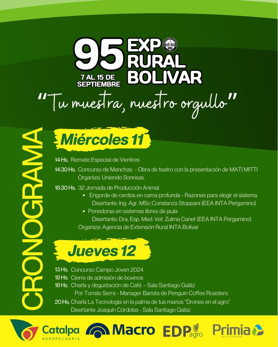 Desde las 18:30 continúa el ciclo de charlas con la Jornada de Producción Animal. Las charlas serán: "Engorde de cerdos en cama profunda - Razones para elegir el sistema" a cargo de la ingeniera agrónoma Constanza Stoppani y "Ponedoras en sistemas libre jaula", con la disertación de la Dra. médica veterinaria Zulma Canet. Organiza INTA Bolívar.