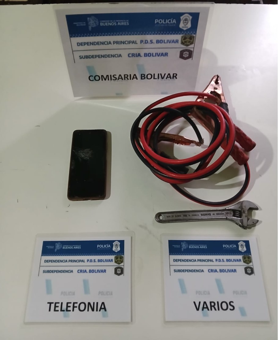 Durante el procedimiento se secuestraron una llave francesa marca Bahco, pinzas tipo cable para batería color negro y rojo, un teléfono celular Motorola modelo G24 y otros elementos de interés para la causa.