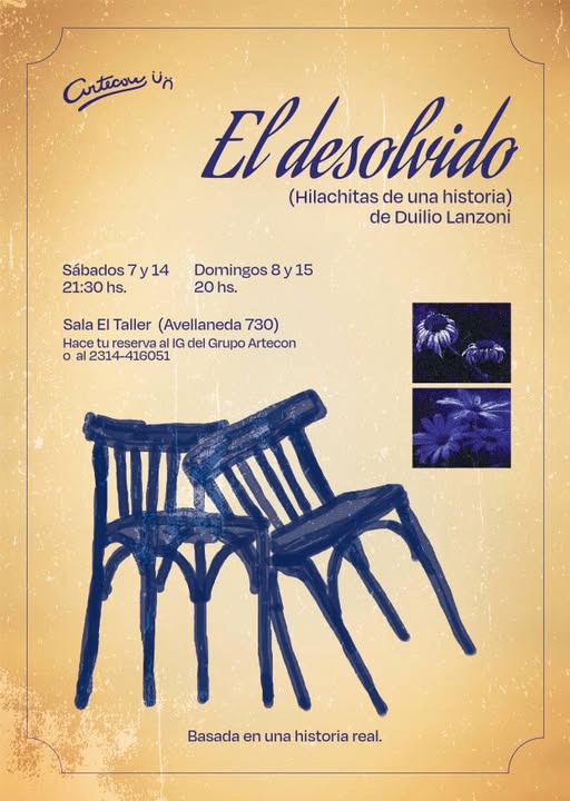 Tras el primer segmento musical subirá a escena por octava vez la obra El Desolvido (Hilachitas de una historia), de Duilio Lanzoni, historia enmarcada entre 1983/84 que da cuenta de los prejuicios y las formas de una época que aún resuenan como ecos deformados y, quizás, amplificados en el presente. A partir de una puesta en donde el artificio escénico no se esconde, se cuenta esta historia de silencios, de amores y de sinrazones.