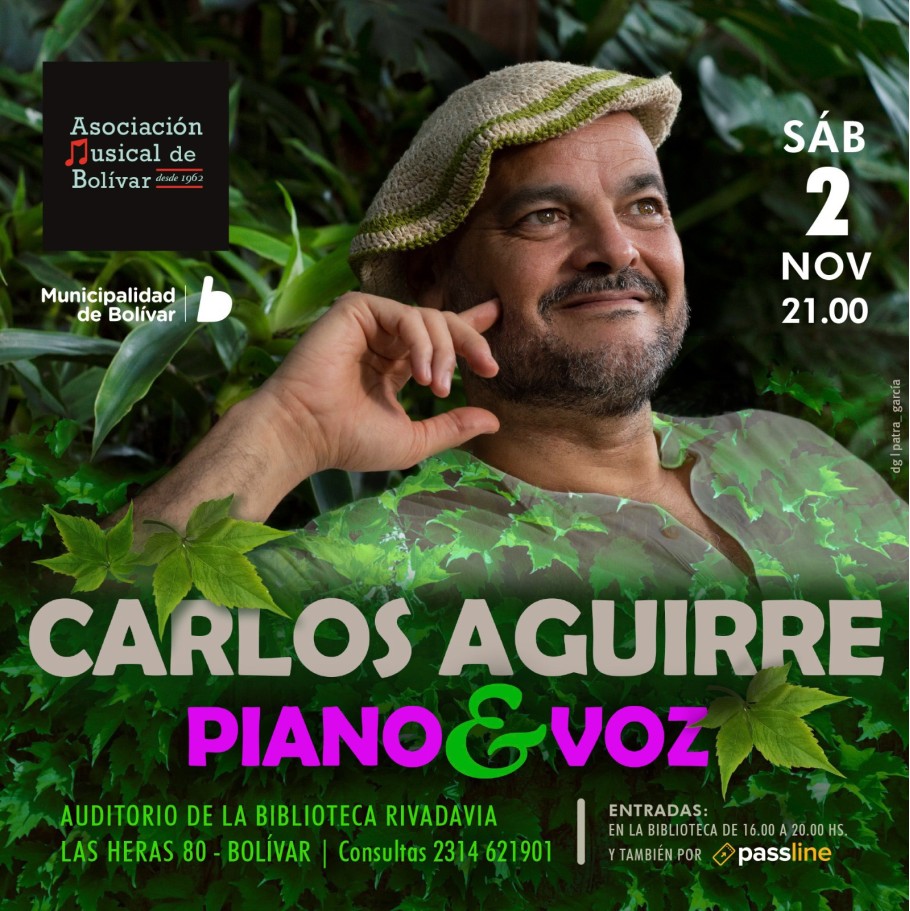El sábado 2 de noviembre a las 21 horas por Medio de la Asociación Musical de Bolívar se presentará en el Auditorio de la Biblioteca Rivadavia, Carlos "Negro" Aguirre. Carlos Aguirre es un pianista, compositor y arreglista entrerriano.