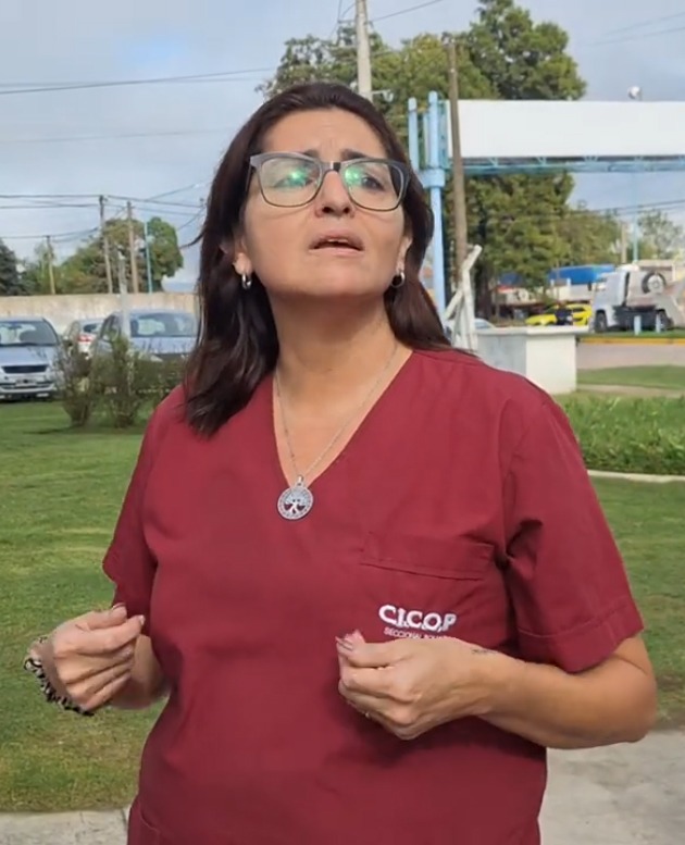 Parada frente a sus colegas, Paola Pérez, secretaria de CICOP, dijo: "Estamos visibilizando la problemática que estamos teniendo de hace seis o siete meses, con salarios congelados y seis grillas salariales atrasadas, y en abril estaremos hablando de siete meses y de siete grillas".