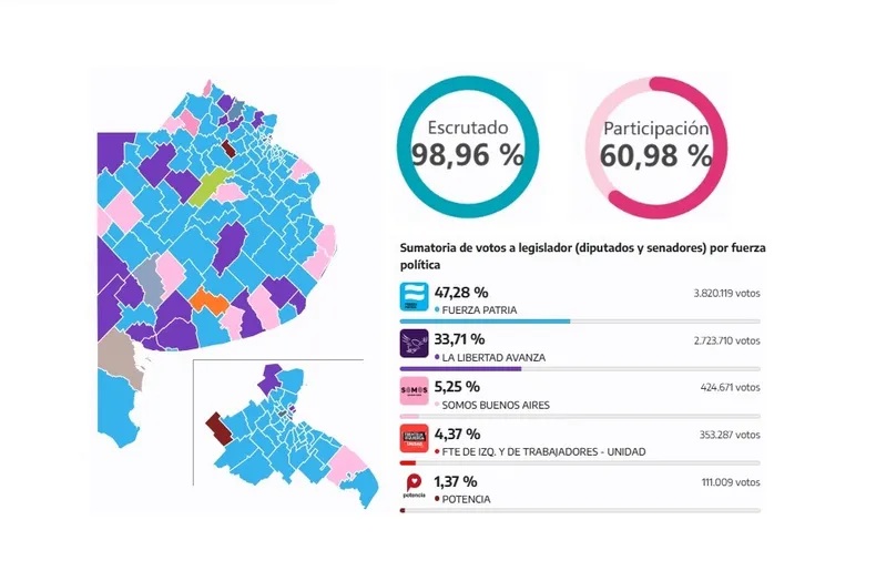 De acuerdo a los datos oficiales y escrutados casi el total de los votos, Fuerza Patria (FP) se impuso con el 47,28% de los votos, seguido por La Libertad Avanza (LLA) con el 33,71%. Muy lejos quedaron Somos Buenos Aires con 5,25%, la izquierda con 4,37% y Potencia 1,37%.