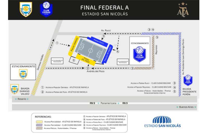 La parcialidad de Bolívar se ubicará en la Tribuna Popular "Reynoso" y Platea "Rucci". Se recomienda acceder desde la ciudad de Junín por Ruta N° 65, tomar Ruta N° 7, luego Ruta N° 188, y continuar estadio por Ruta N°9 a San Nicolás, bajada Av. Presidente Perón hasta Av. Rucci.