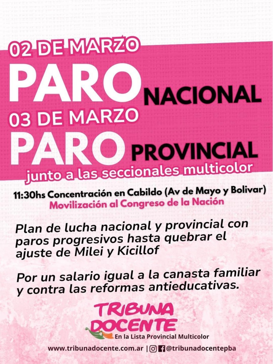 El paro del 3 de marzo se inscribe en una serie de medidas de fuerza impulsadas por el sector. De acuerdo con la Multicolor, la jornada da continuidad al paro realizado el 2 de febrero, resuelto en un plenario provincial con mandato de más de 32 distritos, y se suma además al paro nacional del 2 de marzo, al que también adhirieron como agrupación. Desde el espacio aclararon que la huelga del 2 de marzo estuvo dirigida al Gobierno nacional, mientras que la del 3 tuvo como destinatario al Ejecutivo bonaerense.