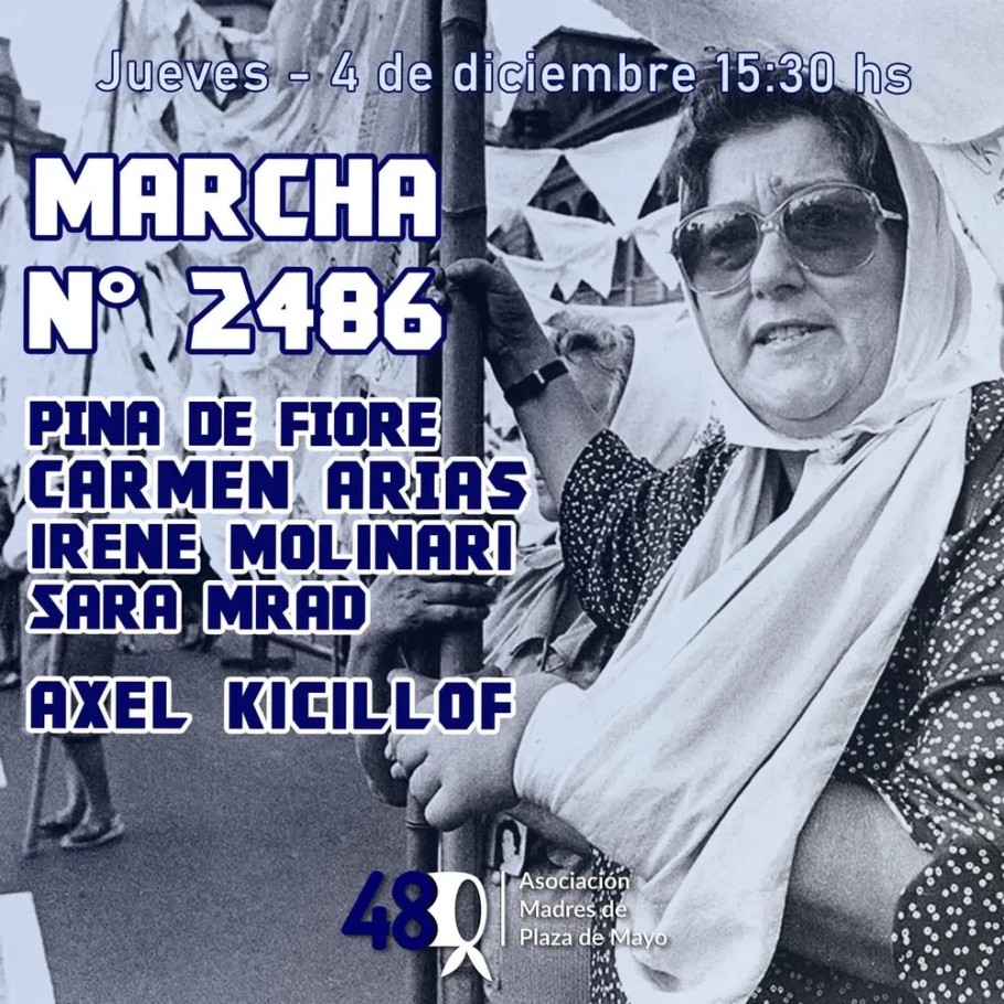 La convocatoria fue anunciada desde las redes oficiales de Madres de Plaza de Mayo. "Este jueves, día de cumpleaños de nuestra eterna compañera Hebe, seguimos luchando en la Marcha de los Jueves, junto a la militancia, Demetrio Iramain y Axel Kicillof", expresaron, en un mensaje que llamó a la presencia masiva en la Plaza.