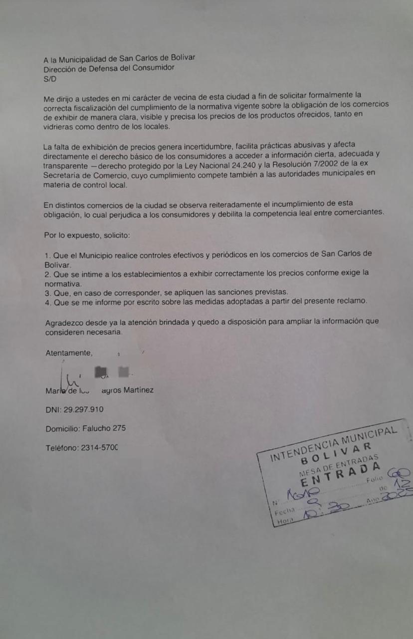 Este martes, ingresó por Mesa de Entradas de la Municipalidad, una nota formal enviada por una vecina de este medio reclamando que se cumpla con la "correcta fiscalización del cumplimiento de la normativa vigente sobre la obligación de los comercios a exhibir de manera clara, visible y precisa los precios de los productos ofrecidos, tanto en vidrieras como dentro de los locales".