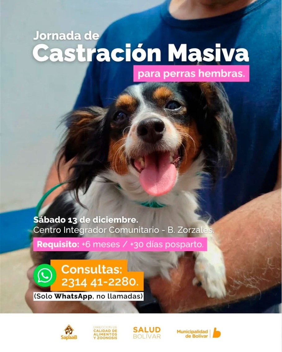 La ONG SAPAAB, tal como lo viene haciendo desde hace varios años, organiza para el día sábado 13 de diciembre una nueva jornada de castraciones masivas, que, en la ocasión, será para perras. Se llevará a cabo en el Centro Integrador Comunitario "Papa Francisco", sito en barrio Zorzales, que gentilmente cede las instalaciones del Centro en ese día, para garantizar que los profesionales trabajen de manera cómoda, organizada y segura.