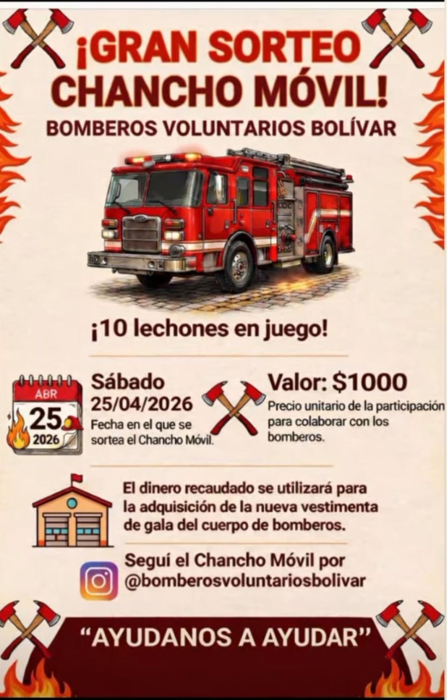 Los Bomberos Voluntarios de Bolívar anunciaron el lanzamiento del "chancho móvil", una iniciativa que posee un objetivo concreto: la compra de los sacos de gala para los integrantes del cuerpo activo. El mismo, se realizará el sábado 25 de abril de 2026 y cada número tiene un valor de $1000.
